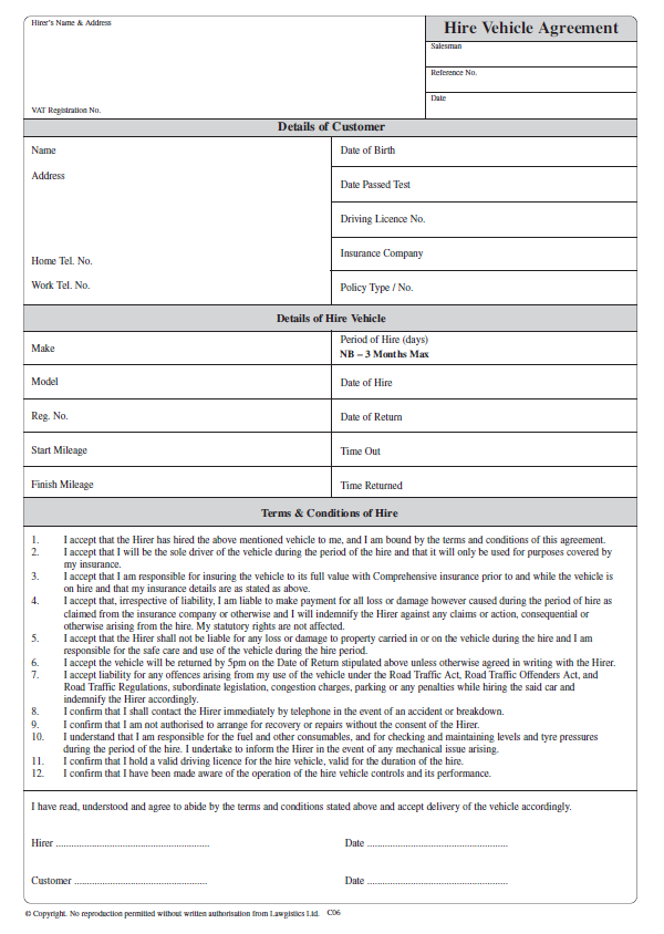 They include Terms and Conditions to protect you against parking tickets, speeding fines, damage to the vehicle and have a blank section to write or stamp your company name, address etc.